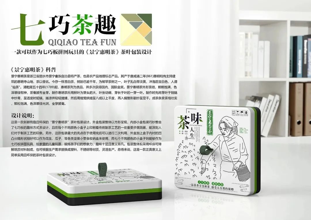 一款新穎有趣且環(huán)保的“景寧惠明茶”茶葉包裝設(shè)計。外盒包裝整體以方形呈現(xiàn),內(nèi)部小盒包裝巧妙整合了七巧板的趣味方式來設(shè)計,且在每個不同顏色小盒子上印刷著傳統(tǒng)制茶工藝的一些重要步驟簡畫,能深刻人們對于制茶工藝的印象。另外,這款包裝最大的亮點在于使用完后可以進行二次利用,外盒加上盒子內(nèi)襯的凹凸分隔形狀剛好可以作為花生、瓜子、等各類堅果小零食收納盒來使用,而七個不同顏色的小盒子則能夠作為七巧板拼圖玩具,給家里的兒童玩耍,鍛煉孩子們的想象力,趣味十足且意義非凡。包裝整體擬采用環(huán)??山到饧堎|(zhì)材料制成,也可根據(jù)生產(chǎn)需求替換成塑料,不銹鋼等材質(zhì),靈活生產(chǎn)??偟脕碚f,這是一款真正意義上簡單實用且環(huán)保的茶葉包裝設(shè)計。