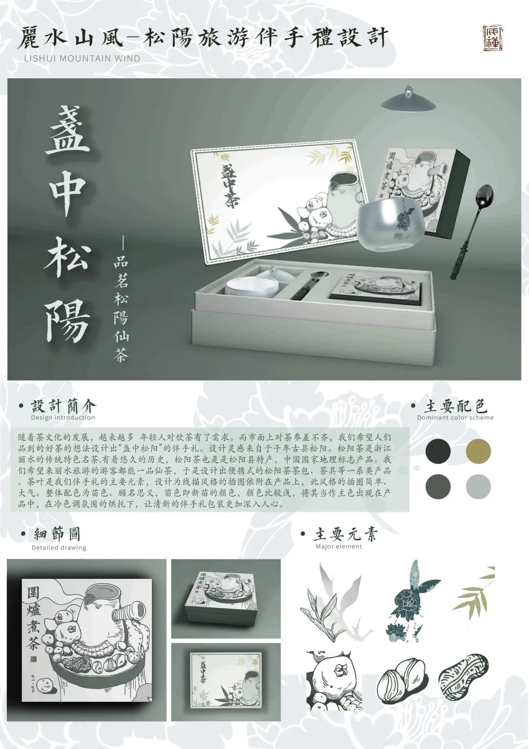 隨著茶文化的發(fā)展,越來越多年輕人對飲茶有了需求。而市面上對茶參差不齊,盞中松陽伴手禮包含了茶杯,茶包,和勺子三樣物品。面對客戶和場合的不同,有時候需要送出比較雅致講究的文化產(chǎn)品。而茶葉和茶具是怎么都不會出錯的存在。在茶包設(shè)計中,我們改變了傳統(tǒng)掛卡的形式。茶包掛卡借用了兔年形象,配上贊美茶香的詩詞,讓普通的茶包詩藝盡顯。