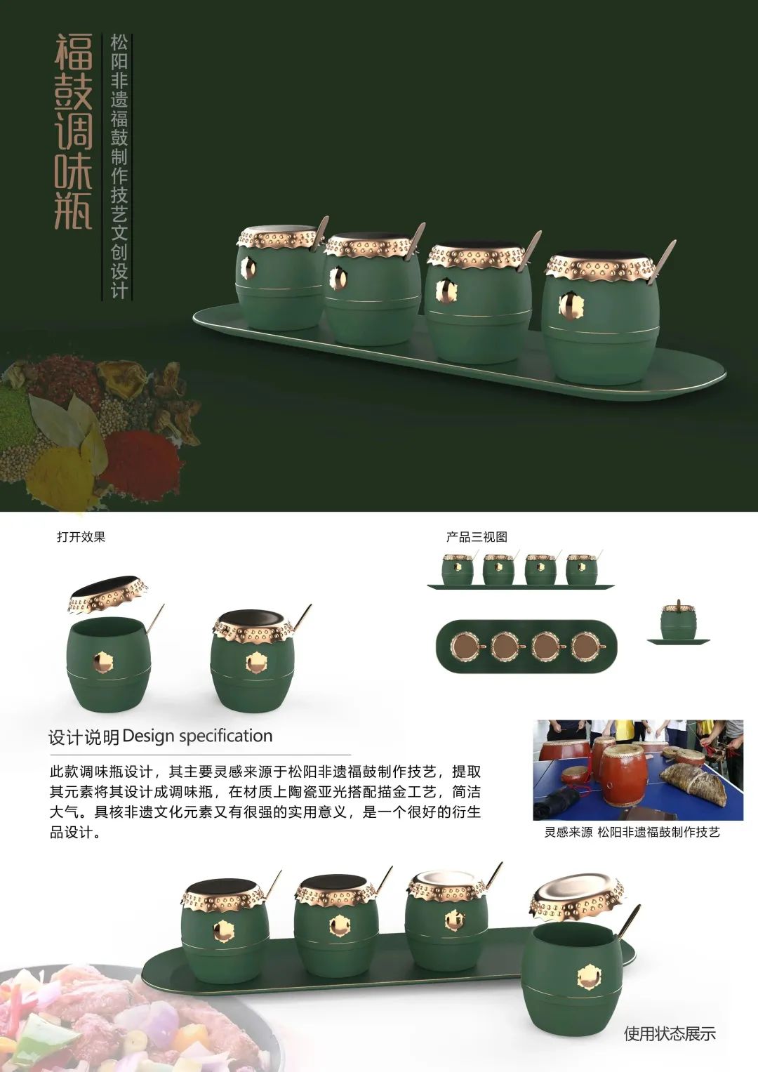 此款調(diào)味瓶設(shè)計,其主要靈感來源于松陽非遺福鼓制作技藝,提取其元素將其設(shè)計成調(diào)味瓶,在材質(zhì)上陶瓷亞光搭配描金工藝,簡潔大氣。具核非遺文化元素又有很強的實用意義,是一個很好的衍生品設(shè)計。