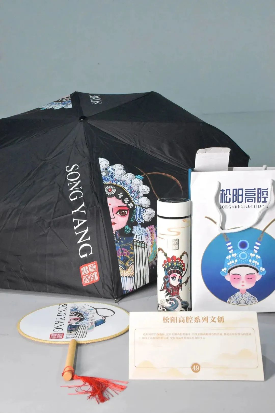 松陽高腔的保溫杯,還有松陽高腔的雨傘,以及松陽高腔特色的團扇,都是在原有物品的基礎(chǔ)上,加深了高腔特色的元素,使得作品更加的富有高腔多元。