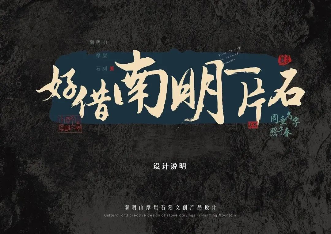 設(shè)計過程:對南明山現(xiàn)有摩崖石刻進行了收集和整理,將部分名人真跡矢量化、元素化;在麗水市博物館查找到了相關(guān)拓片素材,通過拍攝、電腦處理等方式形成新的元素。